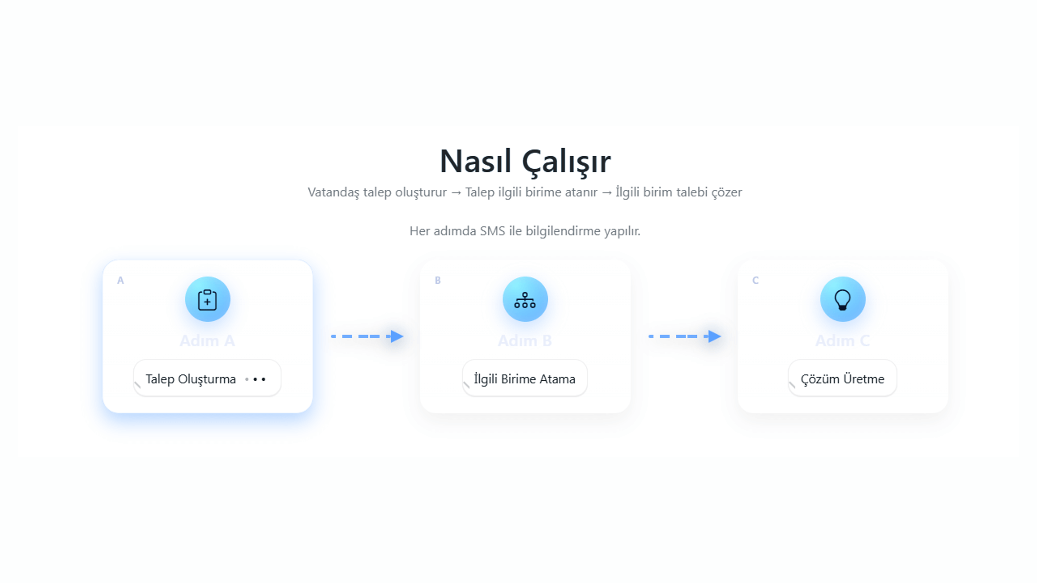 Vatandaş talep oluşturur → Talep ilgili birime atanır → İlgili birim talebi çözer