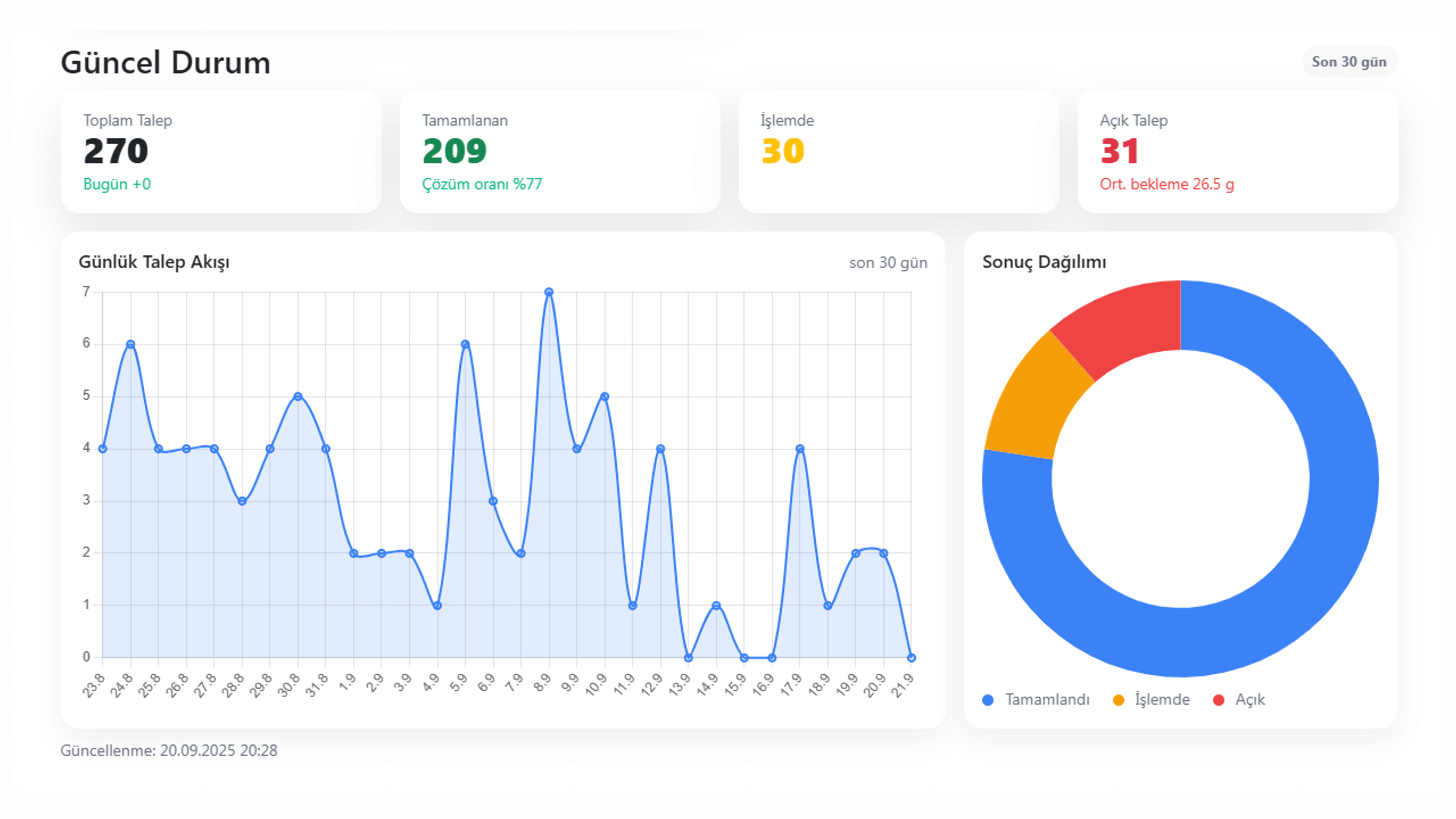 Başkan ve müdürlük panoları; durum, kaynak, birim ve öncelik kırılımlarıyla.