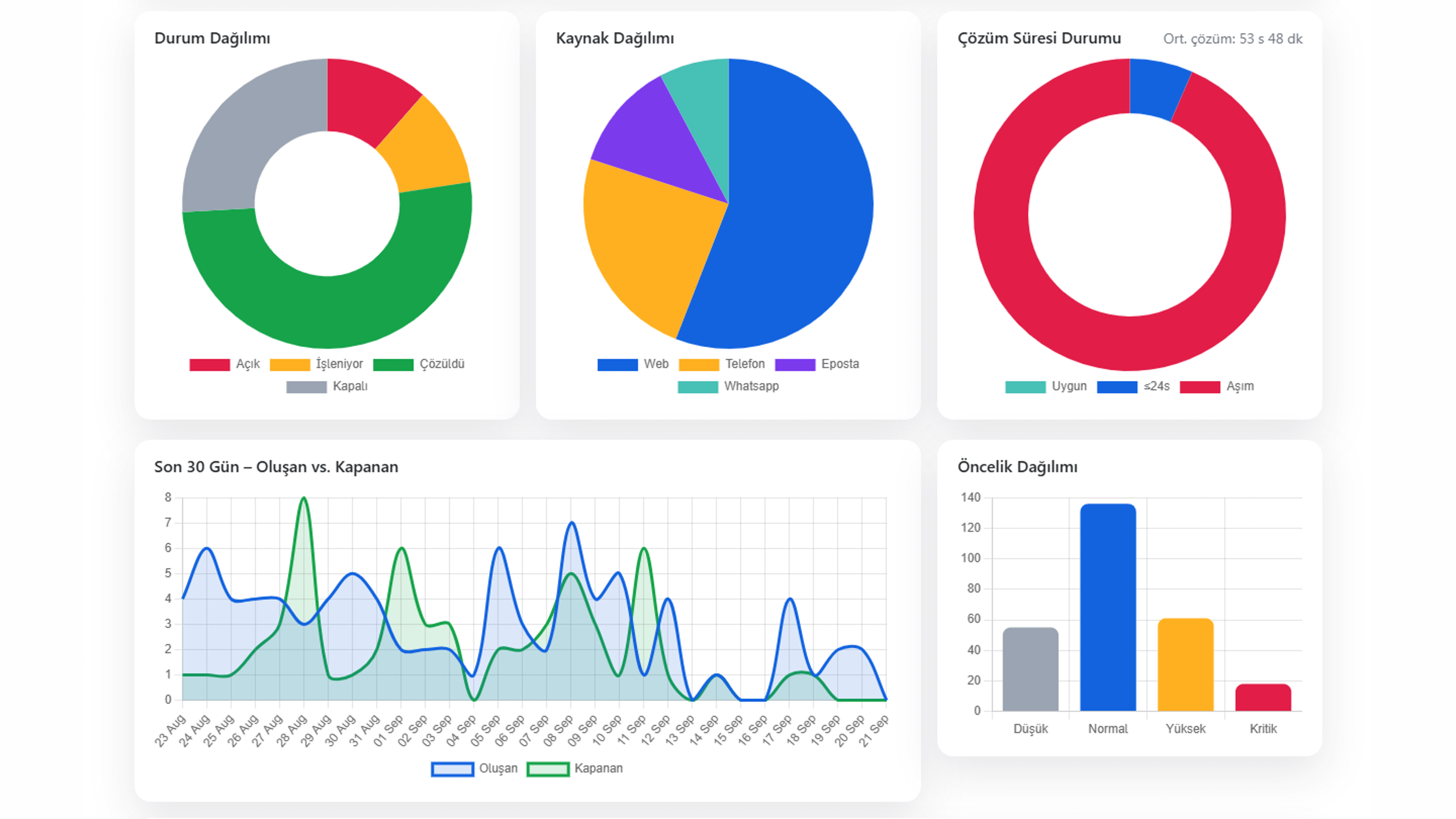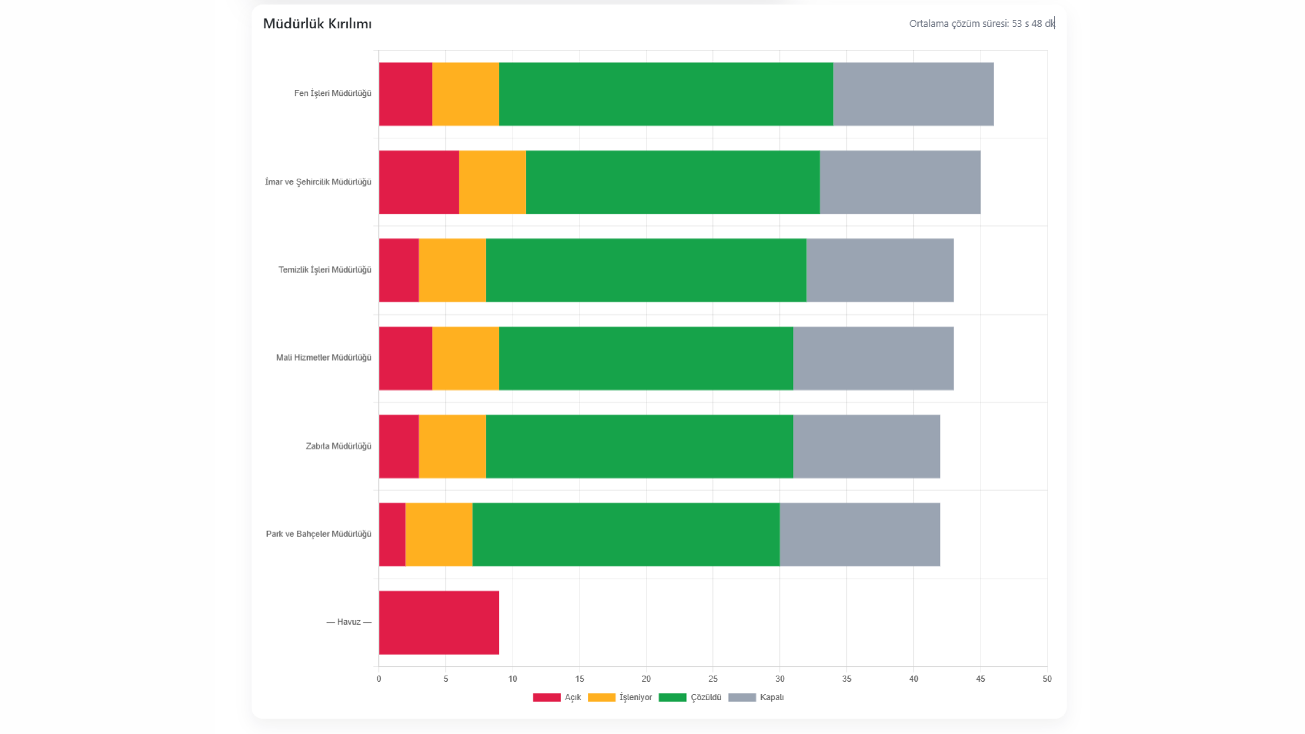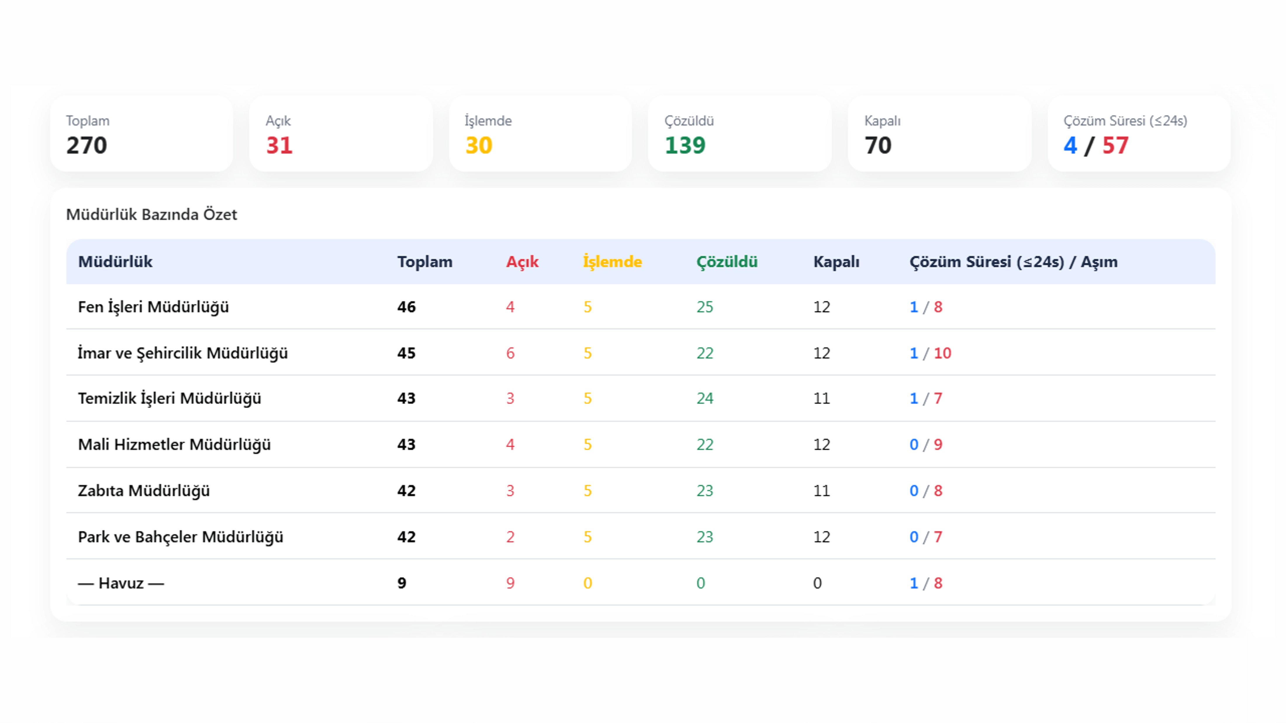 Başkan ve müdürlük panoları; durum, kaynak, birim ve öncelik kırılımlarıyla.